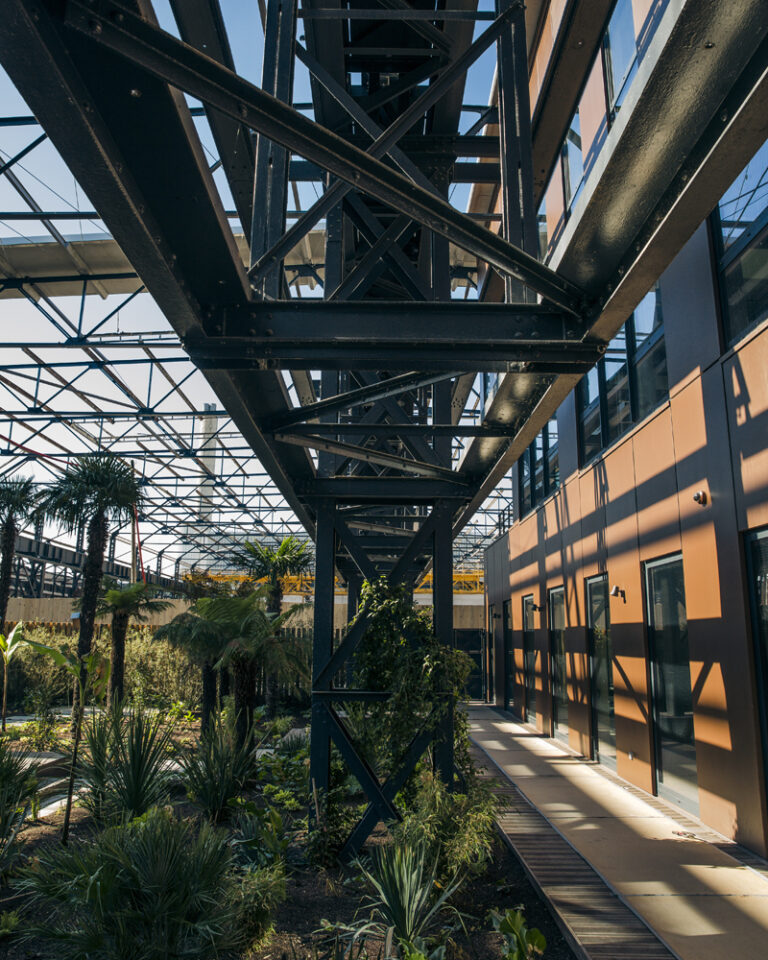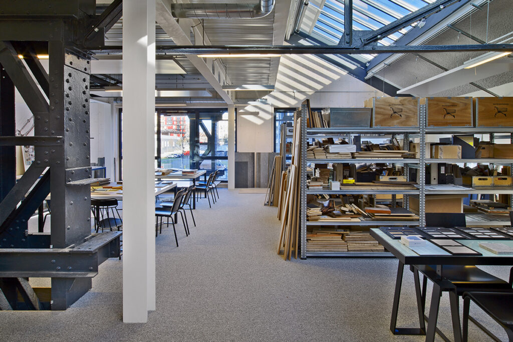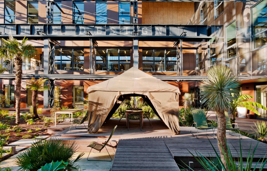 Au cœur des Docks de Saint-Ouen, l’agence a transformé une ancienne halle industrielle Alstom de 1922, pour créer la Manufacture Design, sur près de 5000 m². Cet écoquartier, couvre un tiers de la ville et représente un véritable territoire d’expérimentation participatif. « Ici, nous observons, réfléchissons et imaginons les nouvelles manières de vivre en ville : quartiers innovants, mobilités repensées, nouvelles habitudes de vie et de consommation. Tout cela en intégrant des usages durables et responsables. Mi-campus, mi-atelier, mi-laboratoire, mi-coworking, mi-café, mi-hôtel aussi. » La Manufacture Design abrite une matériauthèque de 150 m². Cet espace est dédié à la recherche et au développement de matériaux respectueux de l’environnement. Dirigé par Sébastien Huille, il fonctionne comme un laboratoire d’innovation et de veille stratégique. Son approche repose sur trois piliers : le prix, l’exploitation et la durabilité.